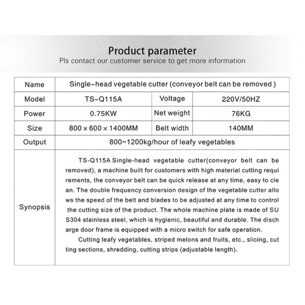 TS - Q115A single-head cutting machine (removable belt), a building for material cutting demanding customer, conveyor belt can be removed at any time, easy to clean. Vegetable cutter double frequency conversion design, can at any time to adjust the speed of belt and blade control product cut size. The machine plate SUS304 stainless steel manufacturing, health, beautiful, durable. Discharging door is equipped with micro switch, safe in operation.Cutting leaf vegetables, strip melon and fruit and so on, slicing, cutting, cutting (adjustable length degrees).